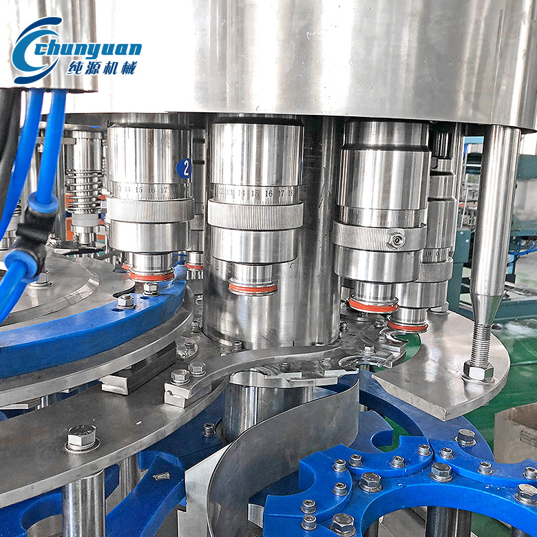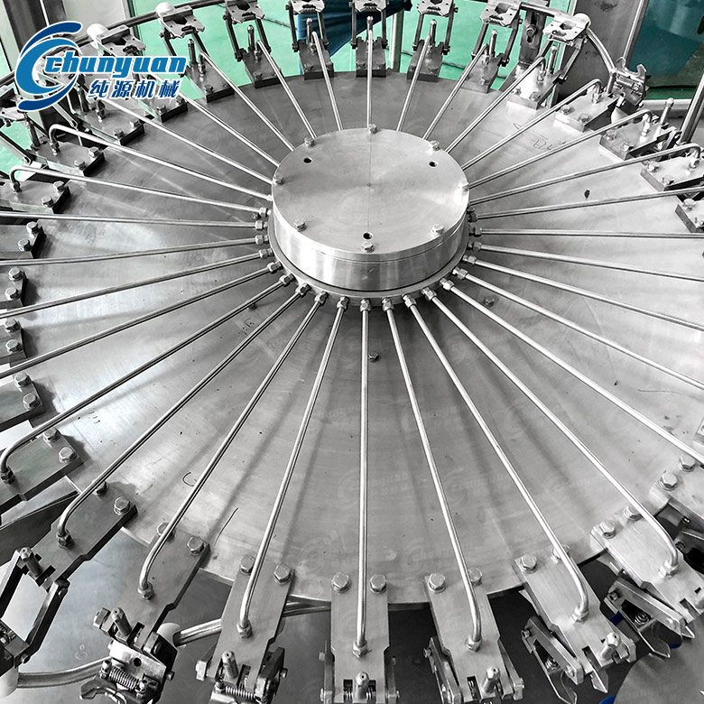 洗凈后的瓶子通過(guò)撥瓶星輪由沖瓶機(jī)導(dǎo)出并傳送至小瓶裝三合一純凈水設(shè)備。進(jìn)入灌裝機(jī)的瓶子由瓶頸托板卡住并在凸輪作用下將瓶子上升,然后由瓶口將灌裝閥頂開(kāi)。灌裝采用重力灌裝方式。灌裝閥打開(kāi)后物料通過(guò)灌裝閥完成灌裝過(guò)程,灌裝結(jié)束后瓶口下降離開(kāi)灌裝閥,瓶子通過(guò)卡瓶頸過(guò)渡撥輪進(jìn)入旋蓋機(jī)。